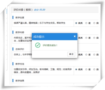 2.学生网上评教提交的信息采用不记名方式统计,期末考试成绩提交前任课教师和管理人员无法查看到具体学生的评价意见。将学生期末考试成绩提交完毕后,教师方可通过教务管理系统查询任课班级学生对本人的总体评教得分及建议。